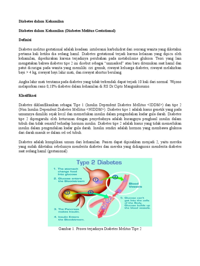 Diabetesdalam pra-kehamilan. kehamilan adalah yang paling ditunggu oleh pasangan yang sudah menikah. namun, wanita dengan diabetes tipe 1 harus ekstra hati-hati dalam menjaga kehamilan mereka sejak pra-kehamilan dan selama kehamilan. pengendalian diabetes harus sempurna sehingga diabetes dalam kehamilan resiko komplikasi diabetes pada kehamilan bisa diminimalkan. Diabetes mellitus gestasional (dmg) didefinisikan sebagai gangguan toleransi glukosa berbagai tingkat yang diketahui pertama kali saat hamil tanpa membedakan apakah penderita perlu mendapat insulin atau tidak. pada kehamilan trimester pertama kadar glukosa akan turun antara 55-65% dan hal ini merupakan respon terhadap transportasi glukosa dari ibu ke janin. Dm dalam kehamilan, dm dan kehamilan (gestational diabetes mellitus gdm) adalah kehamilan normal yang disertai dengan peningkatan insulin resistan (ibu hamil gagal mempertahankan euglycemia). faktor risiko gdm: riwayat keluarga dm, kegemukan, dan glikosuria. Diabetes dalam kehamilan free download as powerpoint presentation (. ppt /. pptx), pdf file (. pdf), text file (. txt) or view presentation slides online. diabetes dalam kehamilan.